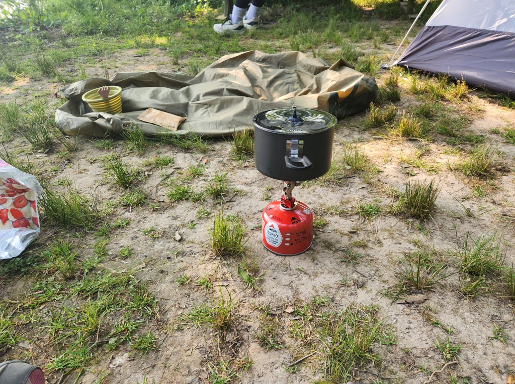 There was a literally perfect branch above the picnic table to hang the filter from, so perfect that I found myself later trying to figure out how a branch could have grown like that, and after we got the filter set up we started to unload the rest of our gear — our tents, our sleeping pads, our sleeping bags. It took us a couple tries and a few broken matches to figure out how to use the stove, and our attempt at smores wrapped in tin foil ended with at least one charbroiled graham cracker, but we got the hang of it by the time it was time to cook dinner after a round of Go Fish.