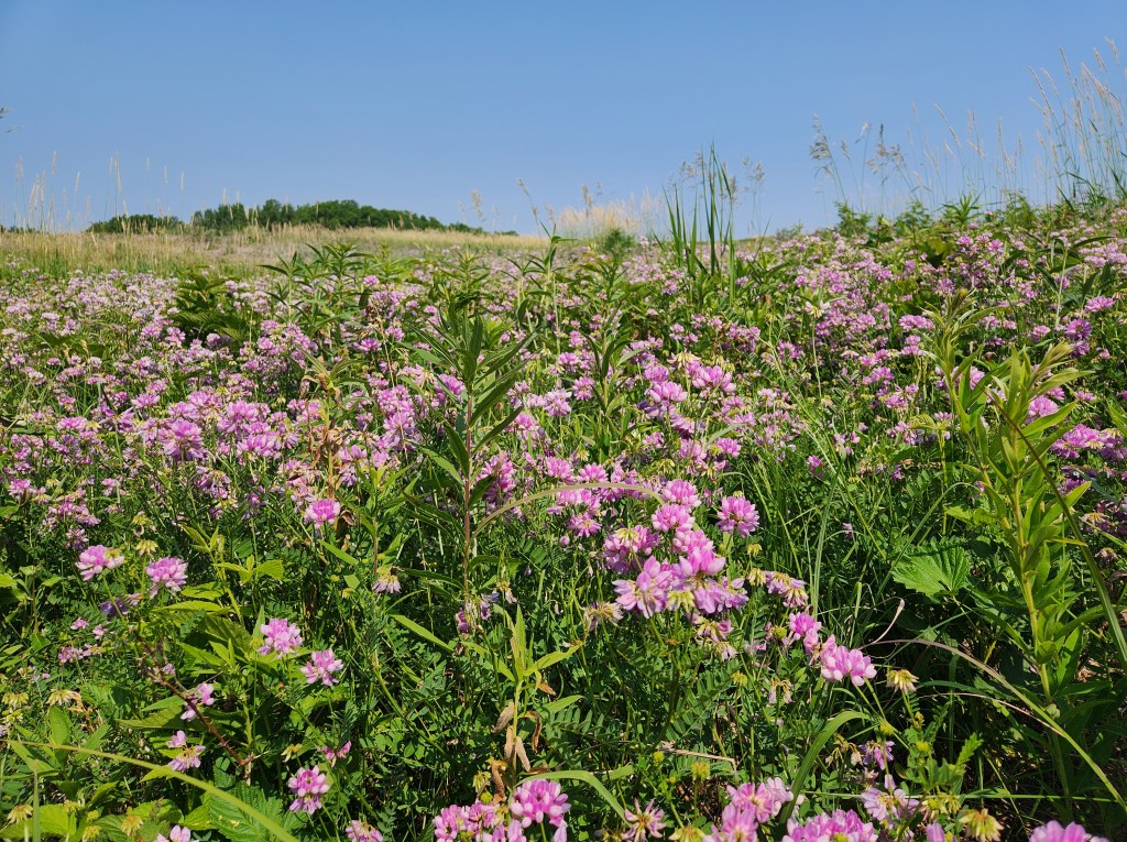 After that, we packed up our campground, figuring out the best way to re-pack our bags, and left around 10 AM to drive half a mile down the road to a 2 mile hiking trail. It was mostly uncovered prairie, with unmowed grassy paths to wade through, but with pretty patches of purple crownvetch. We blazed through the trail in just over an hour, much quicker that I thought we would with 25ish extra pounds on our backs.